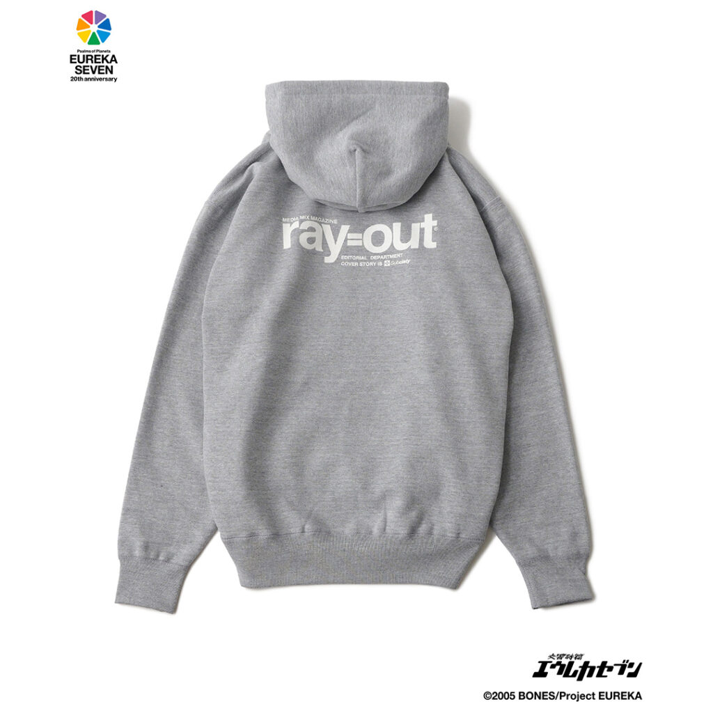 作中に登場する雑誌「ray=out」の編集部用のパーカをイメージ。左胸とバックにロゴをプリントで施しました。ブランドロゴもさりげなくオン。